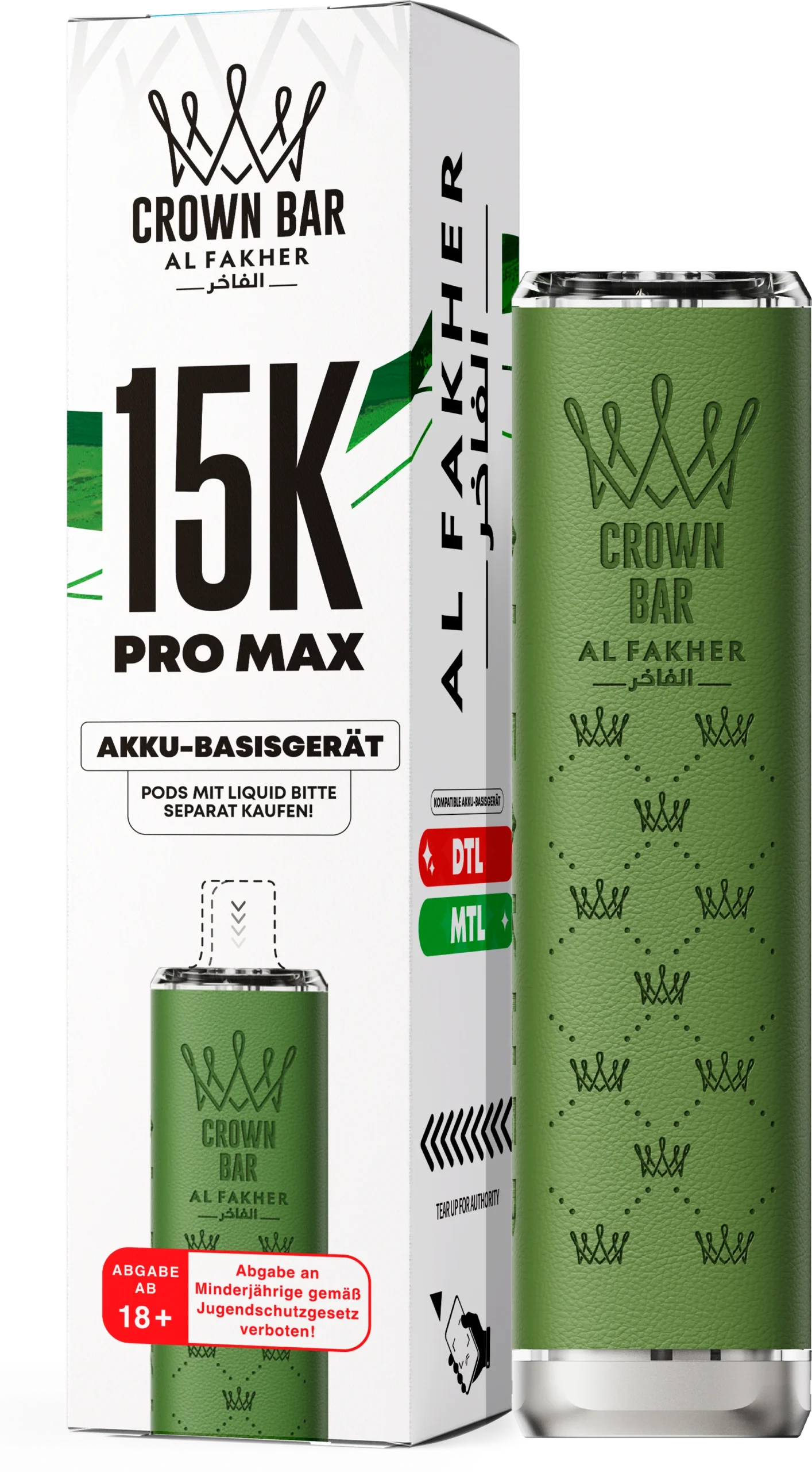 Das Al Fakher 15K Pro Max Basisgerät Green ist die wiederverwendbare technische Basis des 15K Pro Max Pod-Systems. Mit einem integrierten 900 mAh Akku ermöglicht es – in Kombination mit den passenden Pods – eine Nutzung von bis zu 15.000 Zügen (abhängig vom Zugverhalten). Das strukturierte Green-Design bietet eine frische, hochwertige Optik und eine griffige Haptik. Entwickelt für Nutzer, die ein direktes, druckvolles und geschmacksintensives Dampferlebnis bevorzugen.