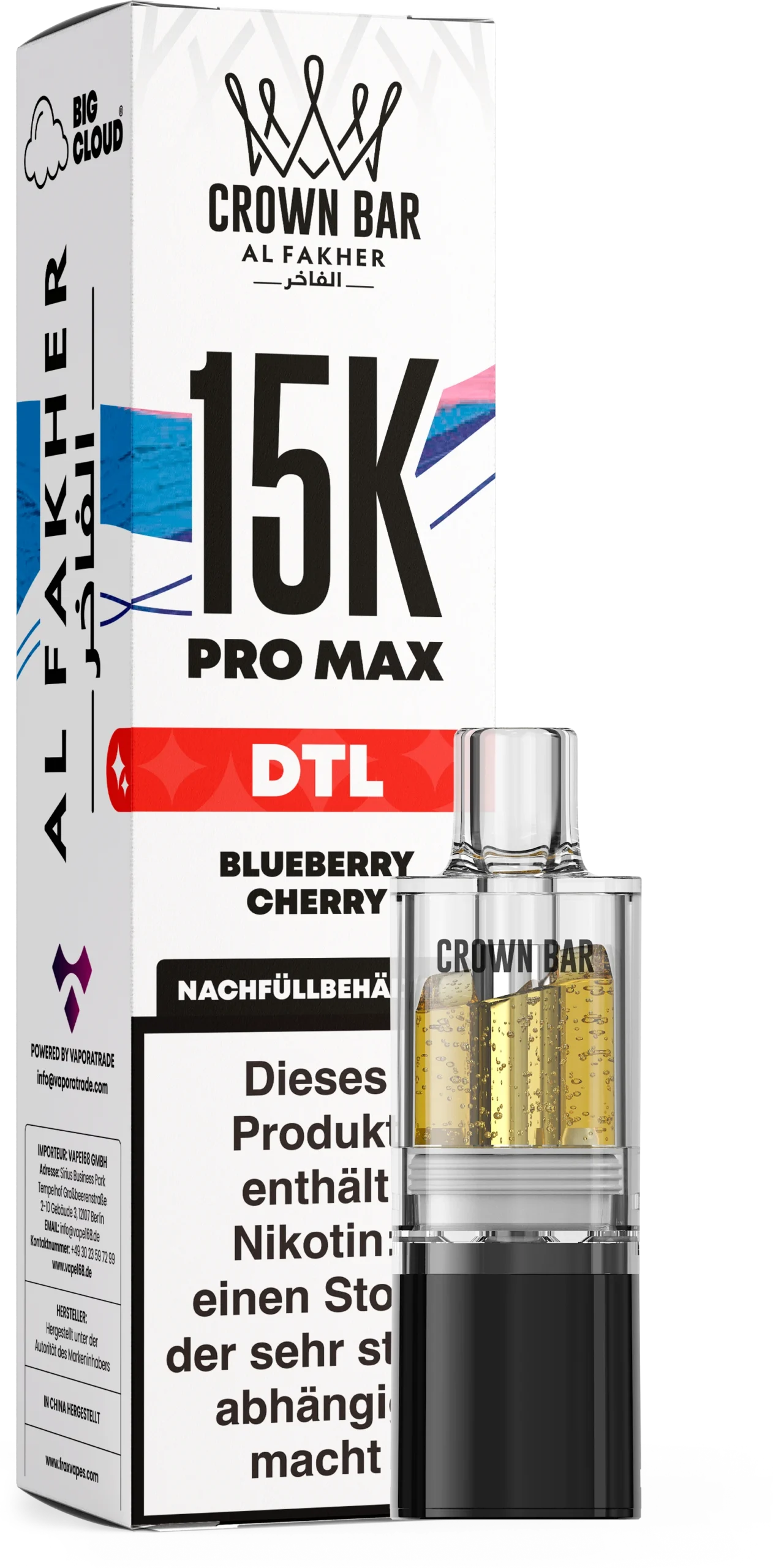 Der Al Fakher 15K Pro Max DTL Pod Blueberry Cherry 6 mg überzeugt durch einen intensiven Beerengeschmack mit aromatischer Kirschnote. In Verbindung mit dem 15K Pro Max Basisgerät entsteht ein kräftiges, direktes und aromastarkes Dampfverhalten – ideal für Liebhaber fruchtiger Geschmacksprofile.