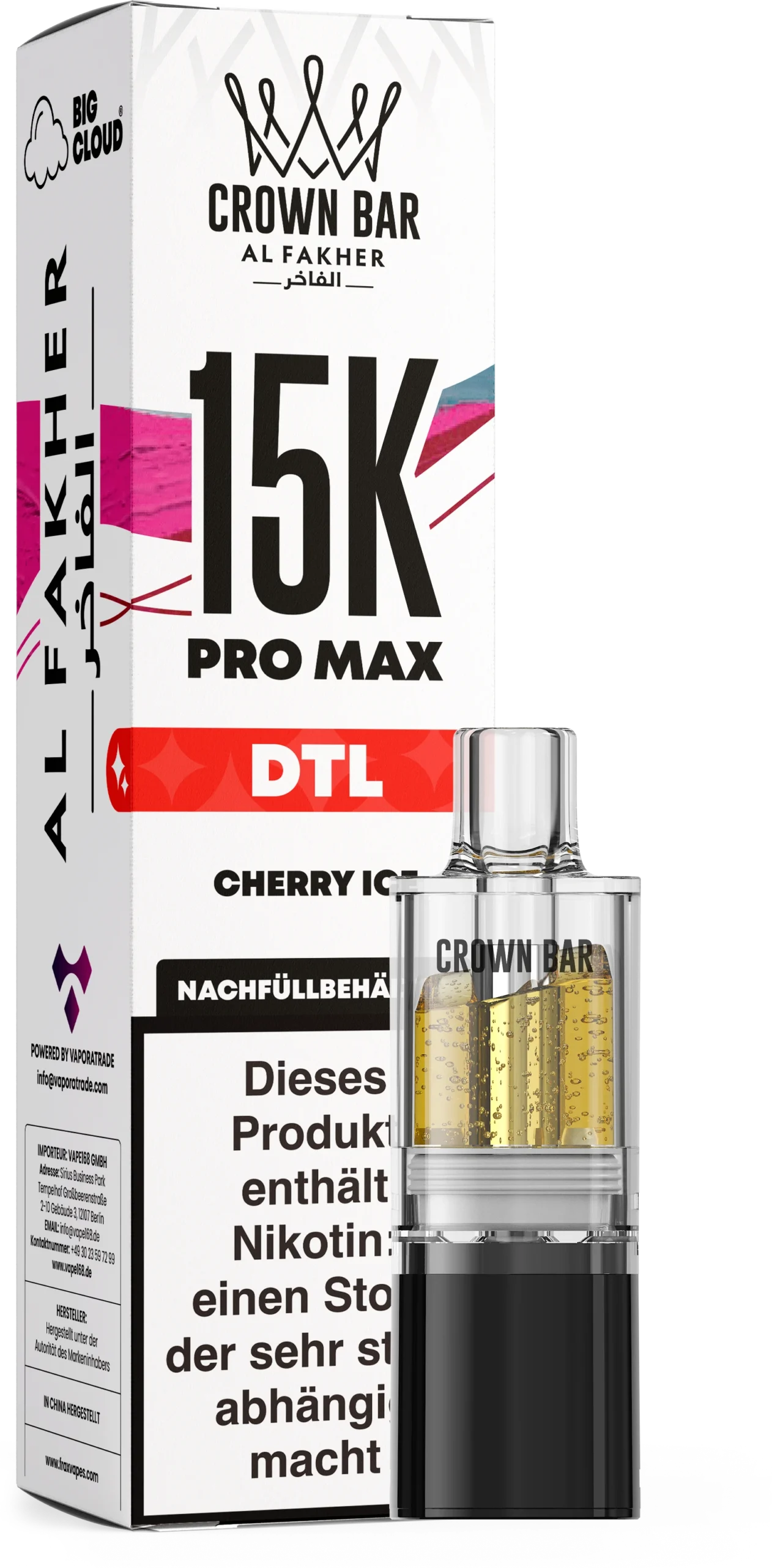 Der Al Fakher 15K Pro Max DTL Pod Cherry Ice 6 mg kombiniert intensiven Kirschgeschmack mit einer klaren Eisfrische. In Verbindung mit dem 15K Basisgerät entsteht ein direktes, aromastarkes und erfrischendes Dampferlebnis – ideal für Dampfer, die fruchtige Kühle bevorzugen.