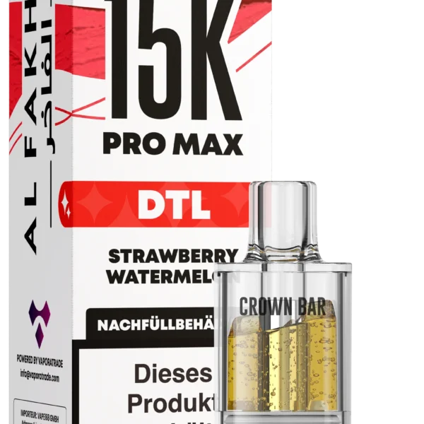 Der Al Fakher 15K Pro Max DTL Pod Strawberry Watermelon mit 6 mg Nikotin vereint die süße Frische reifer Erdbeeren mit dem saftig-leichten Aroma von Wassermelone. Diese fruchtige Kombination wurde speziell für das 15K Pro Max Pod-System entwickelt und richtet sich an Dampfer, die ein direktes, geschmeidig-fruchtiges und angenehm mildes DTL-Dampferlebnis bevorzugen.