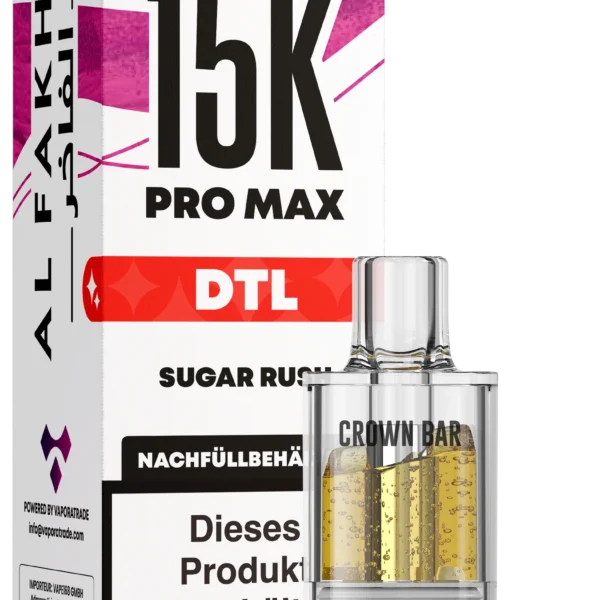 Der Al Fakher 15K Pro Max DTL Pod Sugar Rush mit 6 mg Nikotin bietet ein süßes, intensives und aromatisch belebendes Dampferlebnis. Die Sorte kombiniert verschiedene fruchtige Süßnoten zu einem klar definierten, kraftvollen Candy-Profil. Entwickelt für das 15K Pro Max Pod-System richtet sich Sugar Rush an Dampfer, die ein direktes, süß-betontes und geschmacksintensives DTL-Dampfen bevorzugen.