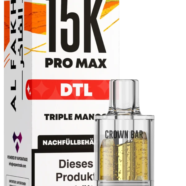 Der Al Fakher 15K Pro Max DTL Pod Triple Mango 6 mg bietet ein intensives, fruchtig-tropisches und vollmundiges Mangoprofil. In Kombination mit dem 15K Basisgerät entsteht ein direktes, kraftvolles und aromenreiches Dampferlebnis – ideal für Fans saftiger, exotischer Sorten.