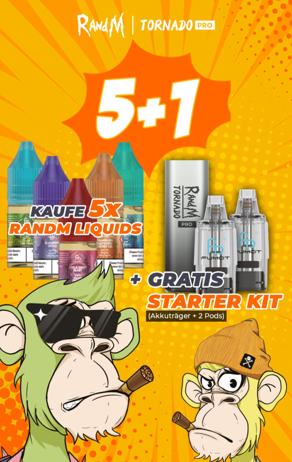 Als Teil der Aktion erhältst du das RandM Liquids 5+1 Starter Kit gratis dazu. Es enthält einen leistungsstarken Akkuträger und zwei Pods, sodass du sofort loslegen kannst. Das Kit ist einfach zu bedienen und ideal für Einsteiger und erfahrene Vaper. Erfahre mehr über die Vorteile des Tornado Pro in unserem Support-Bereich.